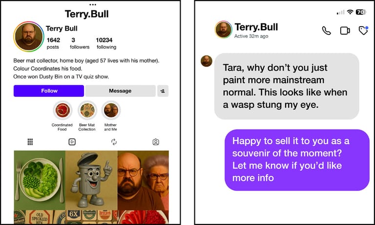 The critic for this piece is Terry Bull, a beer mat collector and long term home boy who still lives with his mother at fifty seven. Known for colour coordinating his meals and proudly retelling the time he won Dusty Bin on a TV quiz show, he prefers things that look mainstream and normal. His comment appears on the companion giclee print.